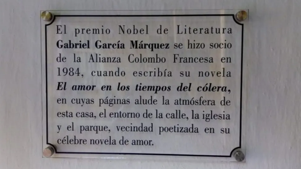 La placa, que de ahora en adelante se incorpora a la ruta del legado de Gabo en Cartagena, declara lo siguiente: “el premio nobel de literatura Gabriel García Márquez se hizo socio de la Alianza Francesa en 1984, cuando escribía su novela El amor en los tiempos del cólera, en cuyas páginas alude a la atmósfera de esta casa, el entorno de la casa y el parque, vecindad poetizada en su célebre novela de amor.”